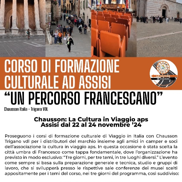 Dal 22 al 24 novembre 2024, c’è l’opportunità partecipare a un evento unico che unisce passione per i viaggi e amore per la cultura: “La Cultura in Viaggio” ad Assisi, organizzato da Chausson e dall’associazione La Cultura in Viaggio . Insieme a distributori, soci, amici camperisti e clienti appassionati, ci immergeremo per tre giorni tra le meraviglie storiche e spirituali della città umbra, accompagnati da un programma ricco e coinvolgente.